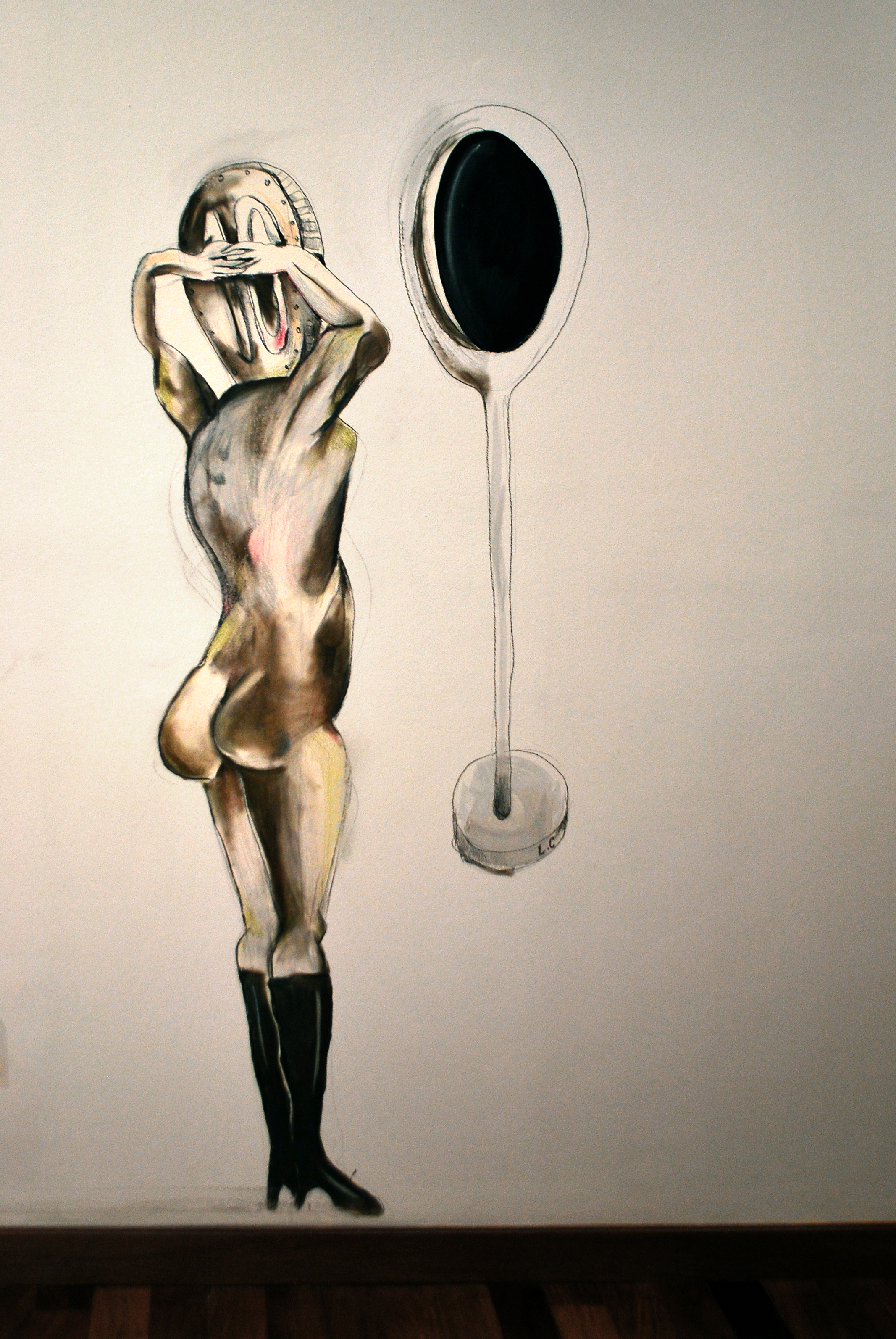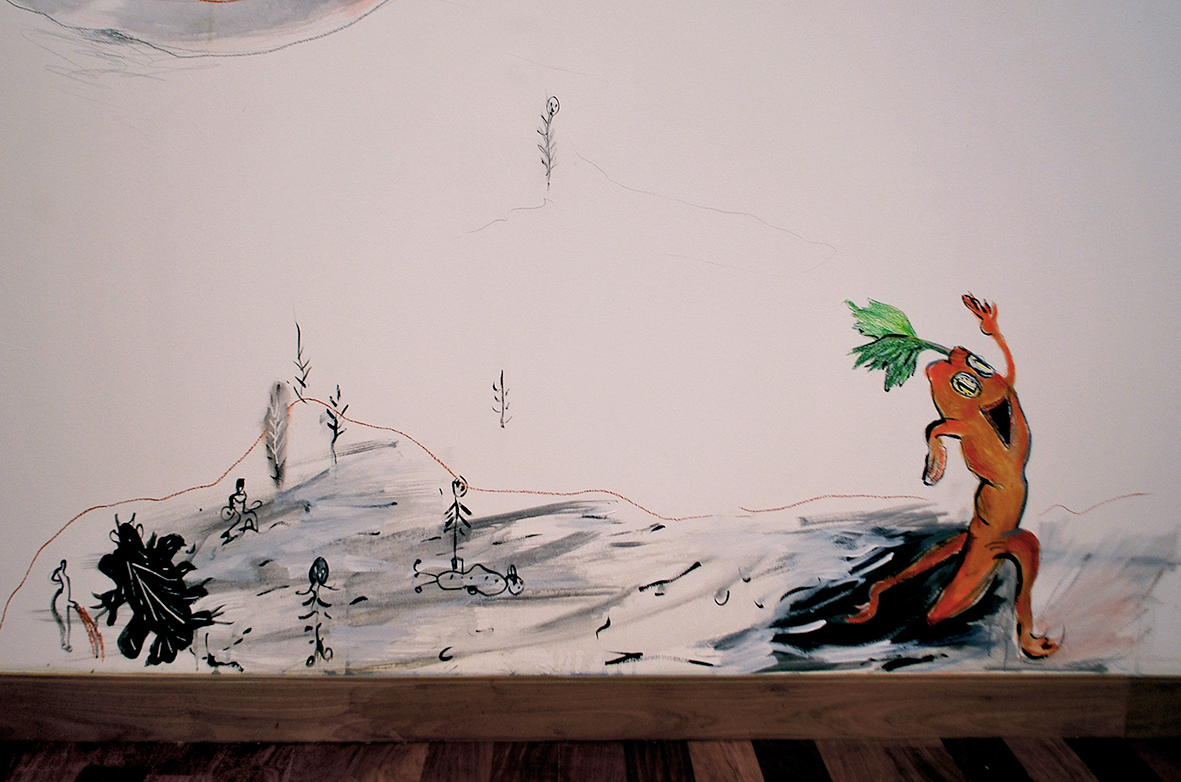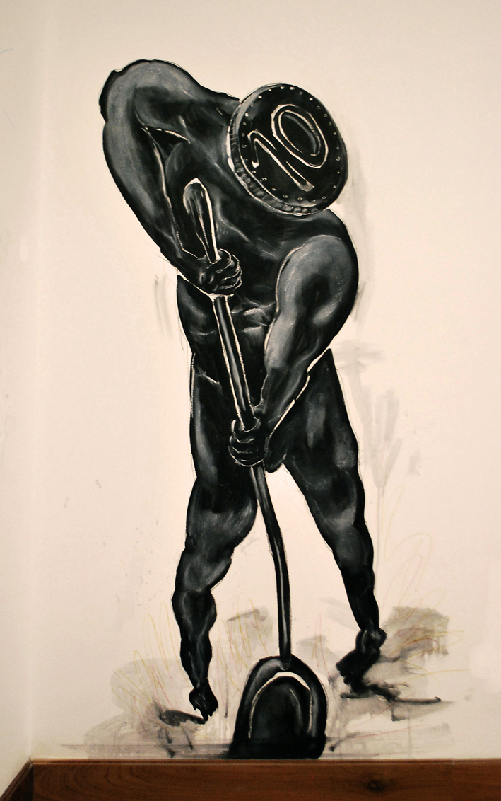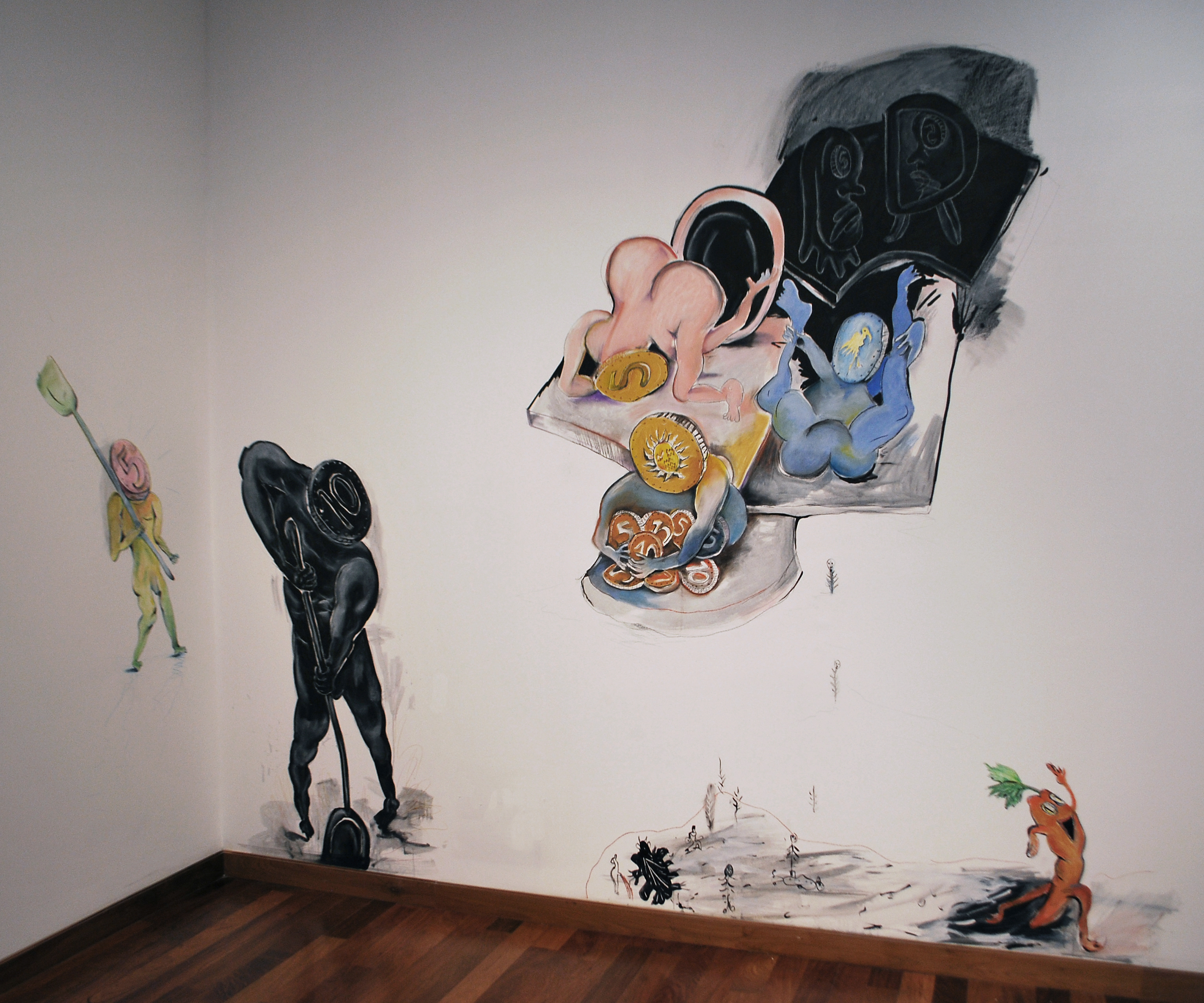 Murales realizados con carbonilla, grafito, tinta y sanguina y dibujos realizados con lápiz sobre papel.