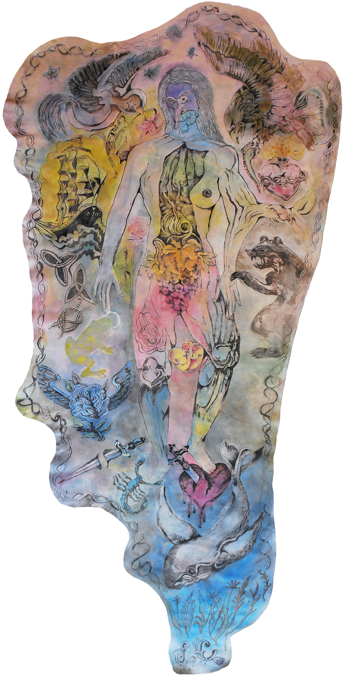 En el eje de la figura humana, una sucesión vertical de colores brillantes corresponde con la posición de los seis chakras hinduistas. Sus efectos resuenan en el cruce de esos centros energéticos con órganos dislocados. En donde se ubica el plexo cardíaco se ve un tejido de testículos semicubierto por un pecho femenino. En la zona intestinal, un nido parece enmarañar la energía sexual que suministran los genitales ocultos tras un racimo de uvas. Códega interpela las concepciones morales. Lo que persiste oculto por la vergüenza se fuga en la exhibición de protuberancias descarnadas bajo mutaciones genéticas. La dependencia de un neonato en equilibrio entre las rodillas del cuerpo delata una humanidad vulnerable transitando un estadio infantil de su historia. El pie que se posa sobre un corazón sangrante afianza la integridad del ser sobre la experiencia del dolor. En una mitología sincrética, Códega propone su ordenamiento cósmico. La sabiduría y la tierra representadas por la serpiente, la fortuna y las fantasías lisérgicas que derivan de una rana flúo o la fuerza brutal de un oso enfurecido se releen entre una silueta en posición de loto, el símbolo del dólar, el sagrado corazón de Jesús y un rostro anciano sin ojos, ni boca imaginado como un agujero negro. En la oscuridad hitchcockiana del árbol poblado de aves rapaces emerge el comportamiento comunitario; entre la belleza, el espanto y el conflicto de la coexistencia.