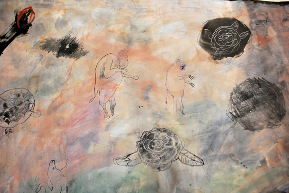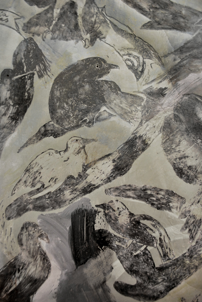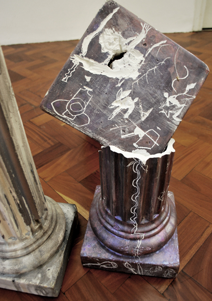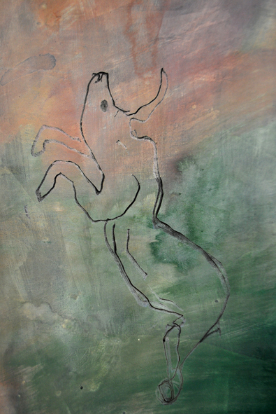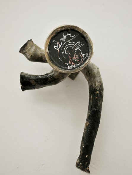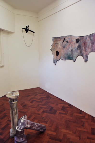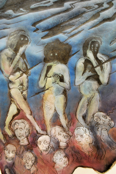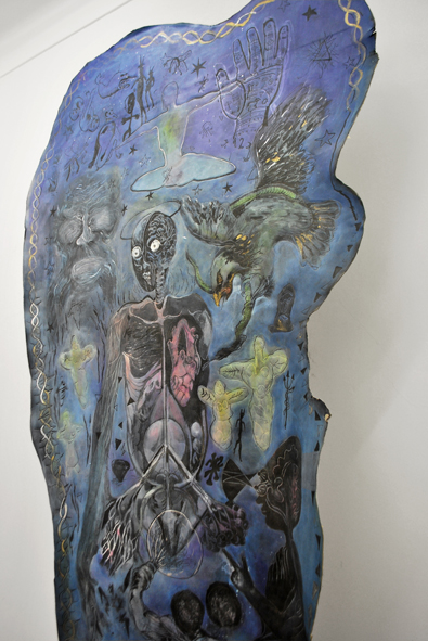 Laura Códega construye una cartografía híbrida sobre la condición humana y agita relaciones entre símbolos ancestrales con un ánimo insolente. Arquetipos, alegorías religiosas y seres mitológicos levitan entre alusiones que van del helenismo al new age con la frescura de una brisa seapunk que sopla sobre la región pampeana. En trozos de cuero pirograbados y pintados en tintas, Códega despliega y repliega anatomías épicas. Dos siluetas antropomorfas estructuran escenas rodeadas por especies animales, demonios, figurasfantasmales y motivos propios de un catálogo de tatuajes old school. Sus atmósferas son humosas aunquelos perfiles se hacen nítidos en las hendiduras del pellejo quemado.