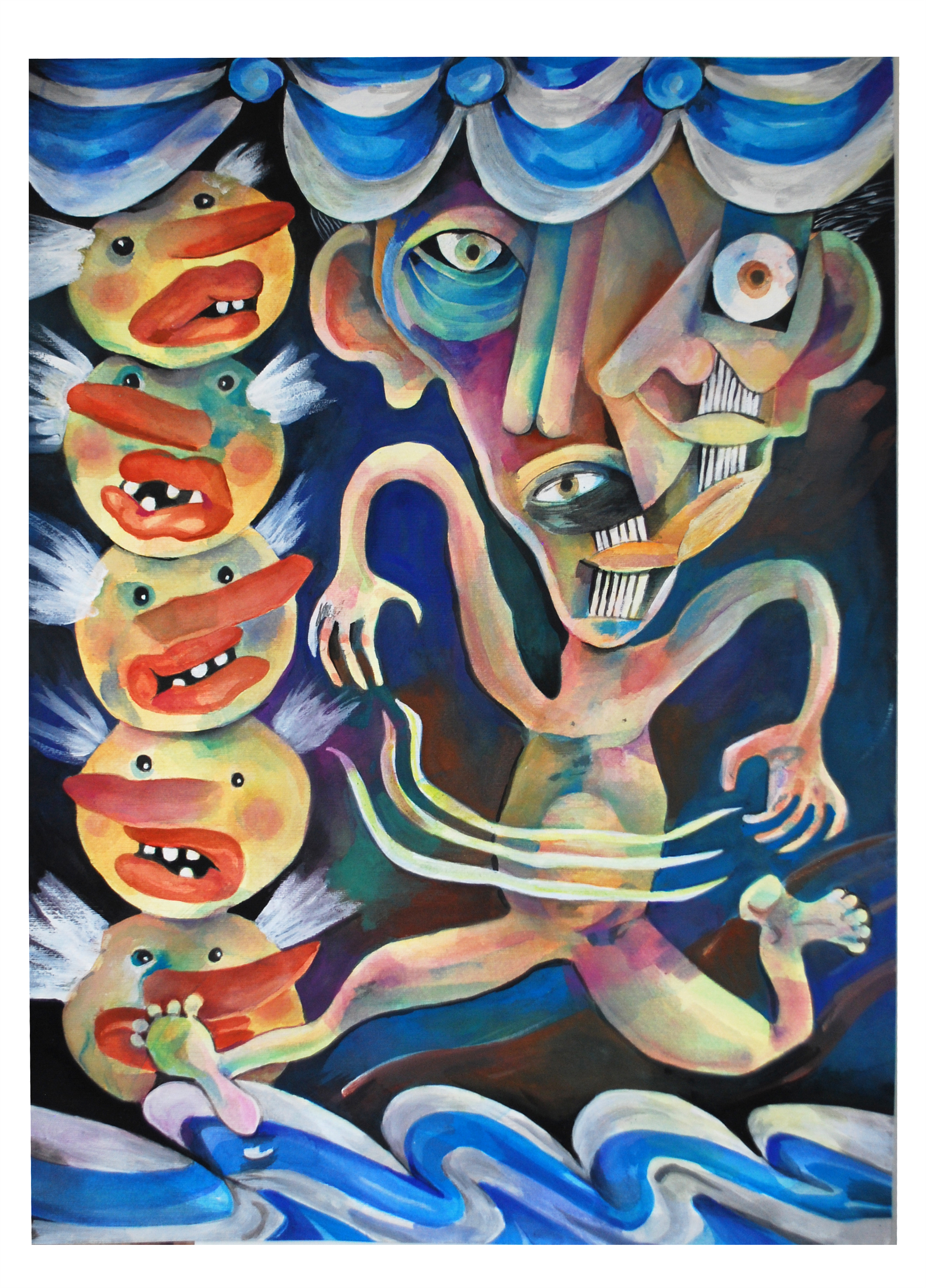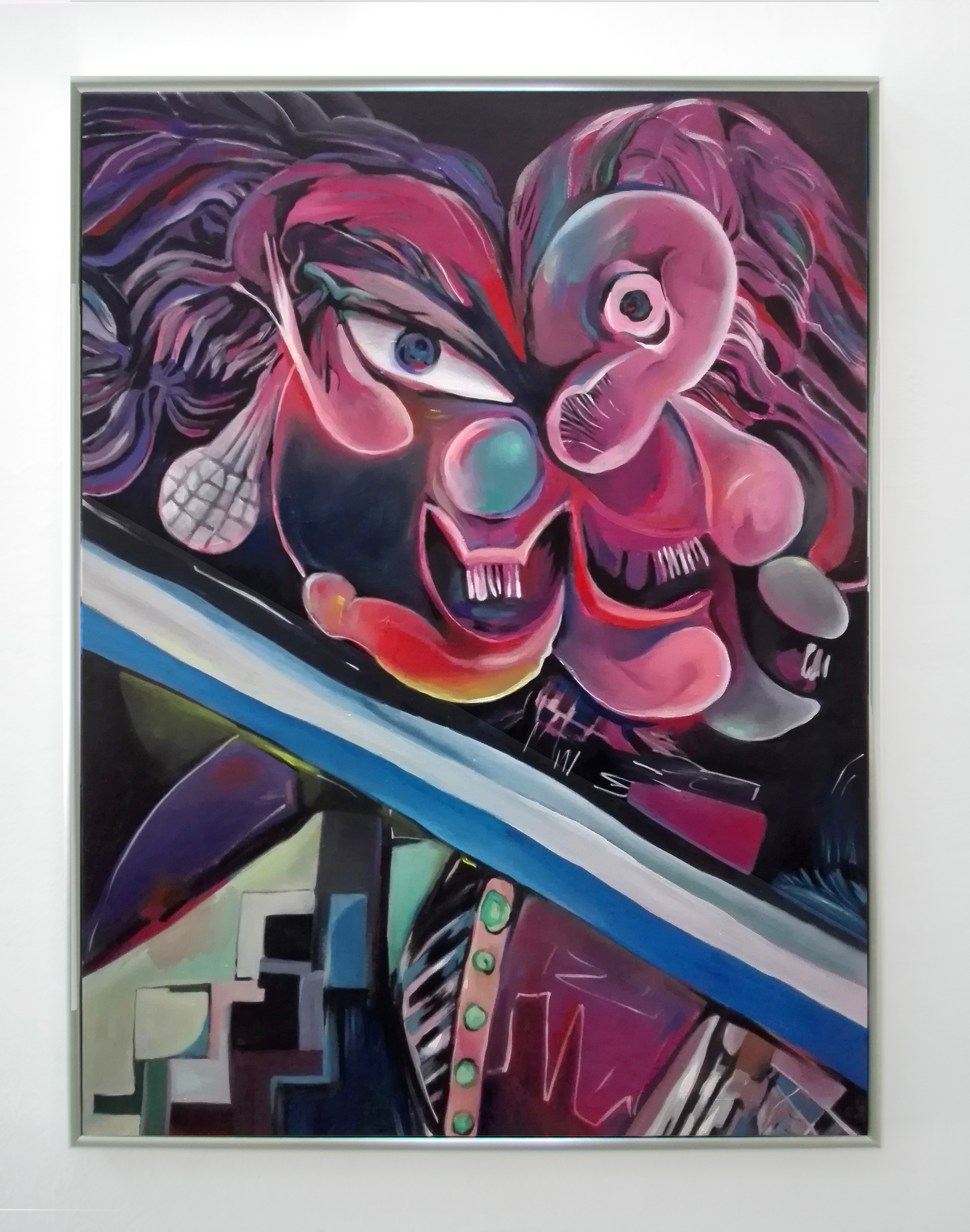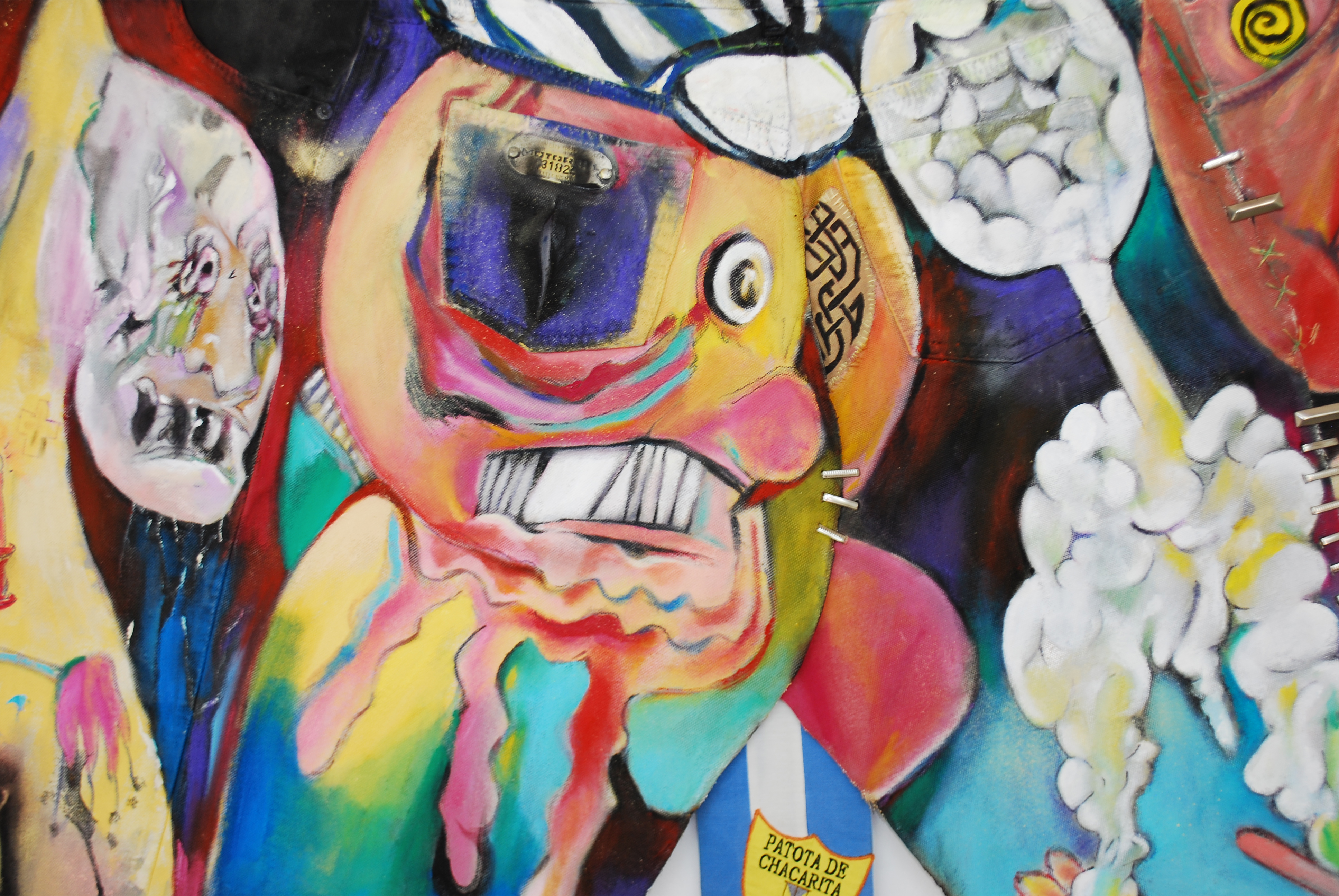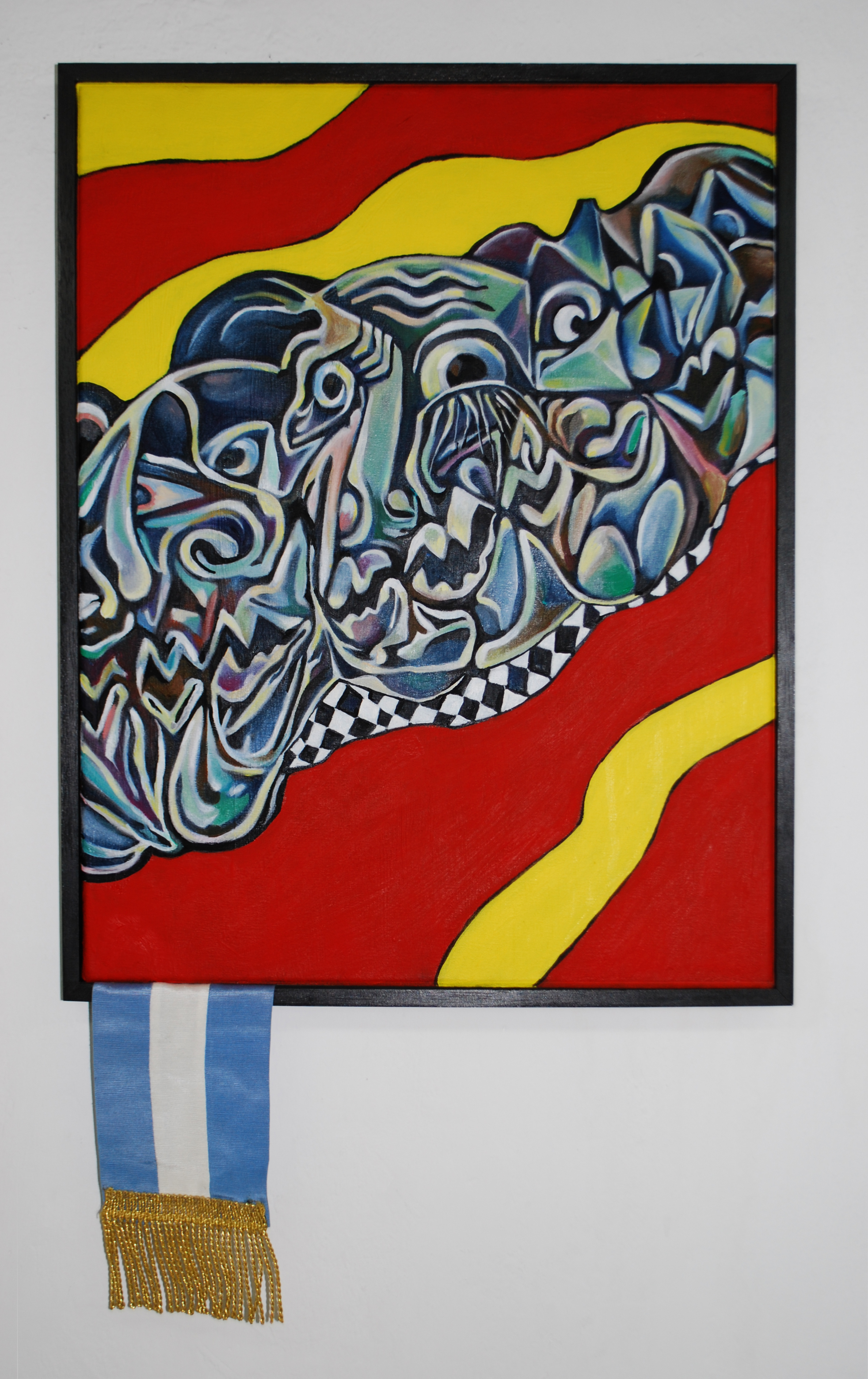 LC: Vos decís “Influencias españolas”, es una bandera que baja desde el noreste de la tela trayendo unos rostros cubistas. Entre otras cosas esa obra alude a que se dice que el arte argentino siempre estuvo muy influenciado por Europa. Lxs argentinxs valoramos secretamente algo y públicamente lo denostamos, jaja, ¡yo lo hago!. ¡El cubismo y sobre todo el surrealismo, fueron desprestigiados por otras facciones del arte! Es que triste o felizmente, según quien lo mire, los símbolos patrios, los símbolos nacionales, no solo en Argentina, son un lastre de algo que está rancio y que tiene un tufillo a encierro. Es pesado. Ya nadie se los banca. Son ruinas, estandartes medievales.