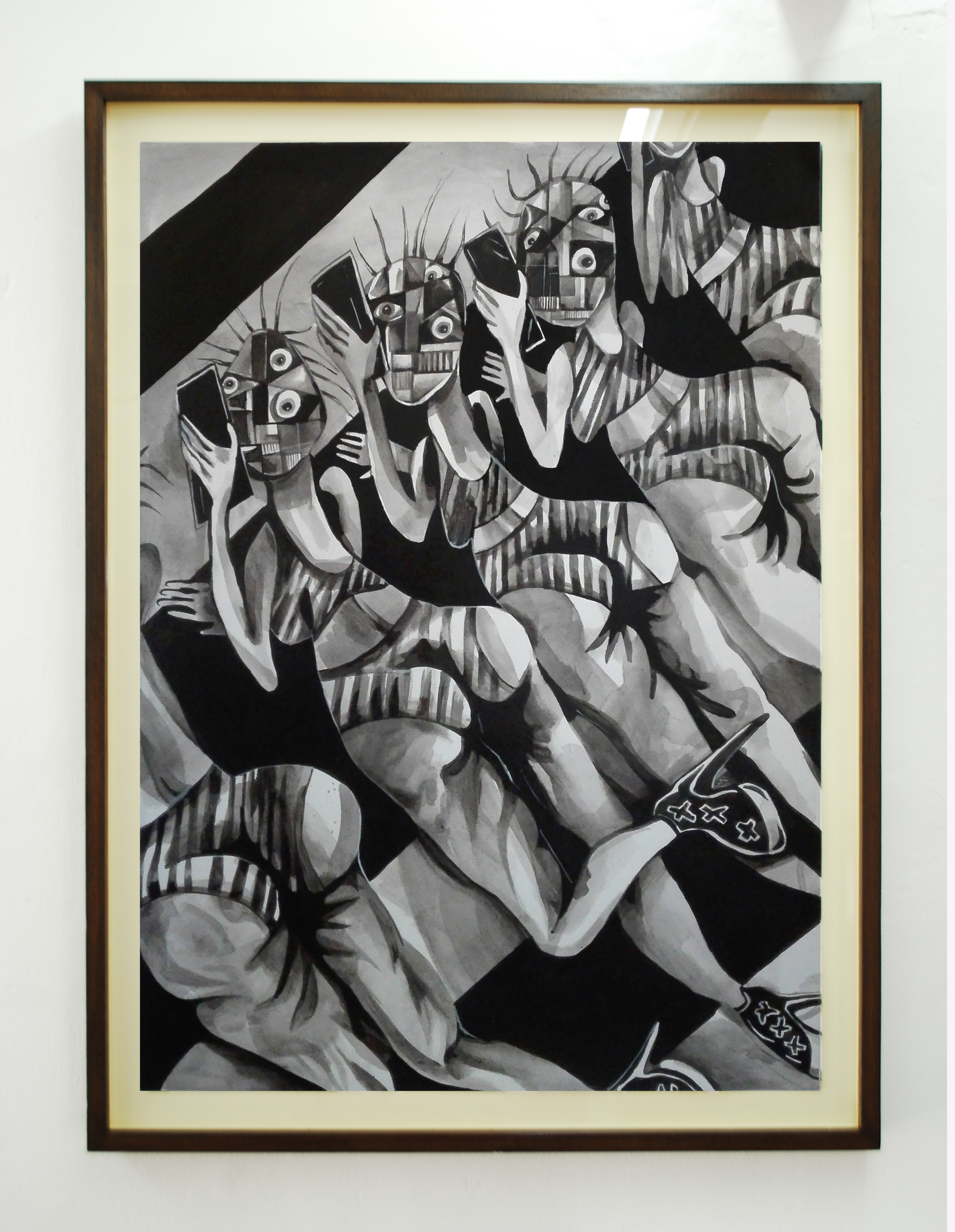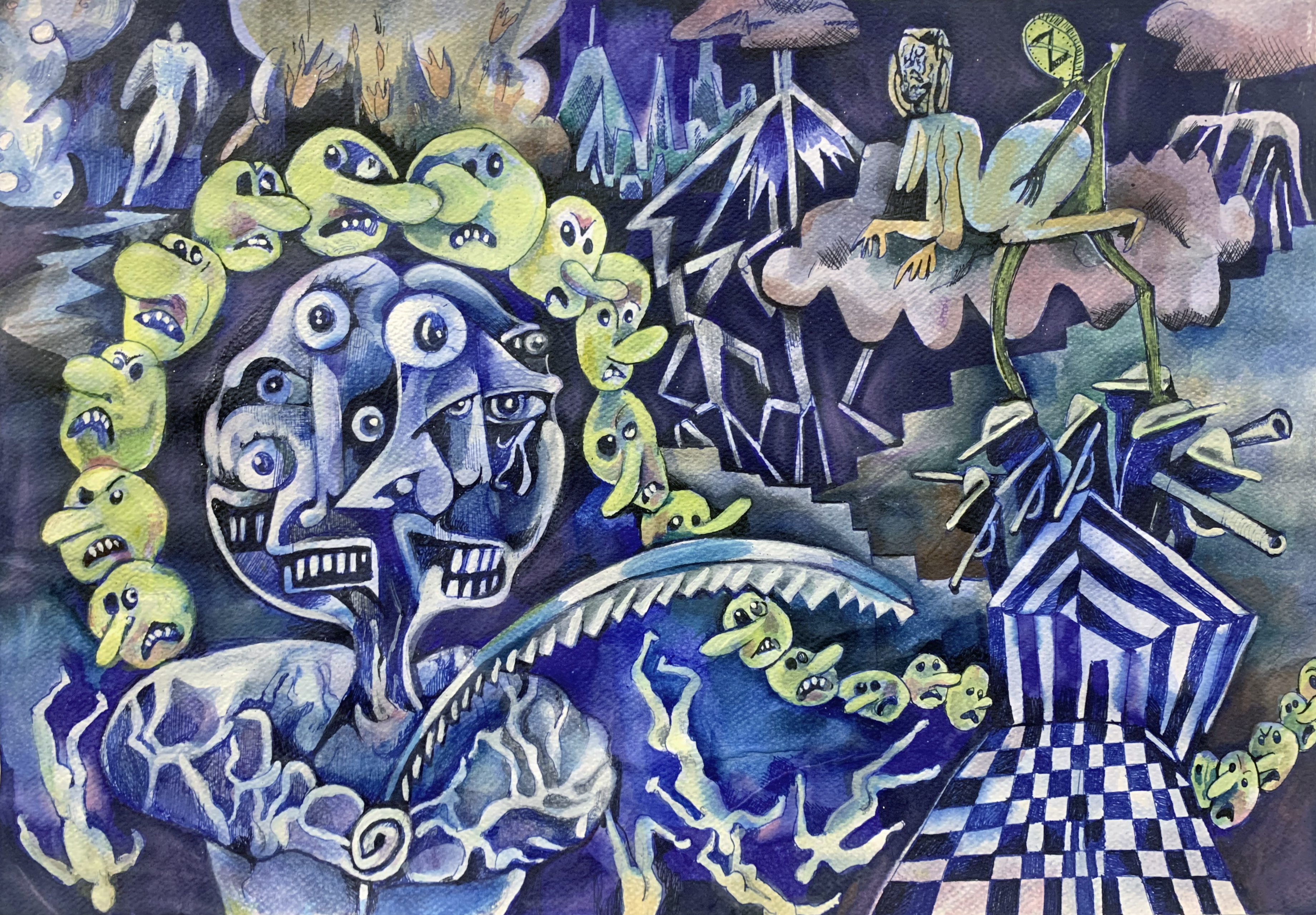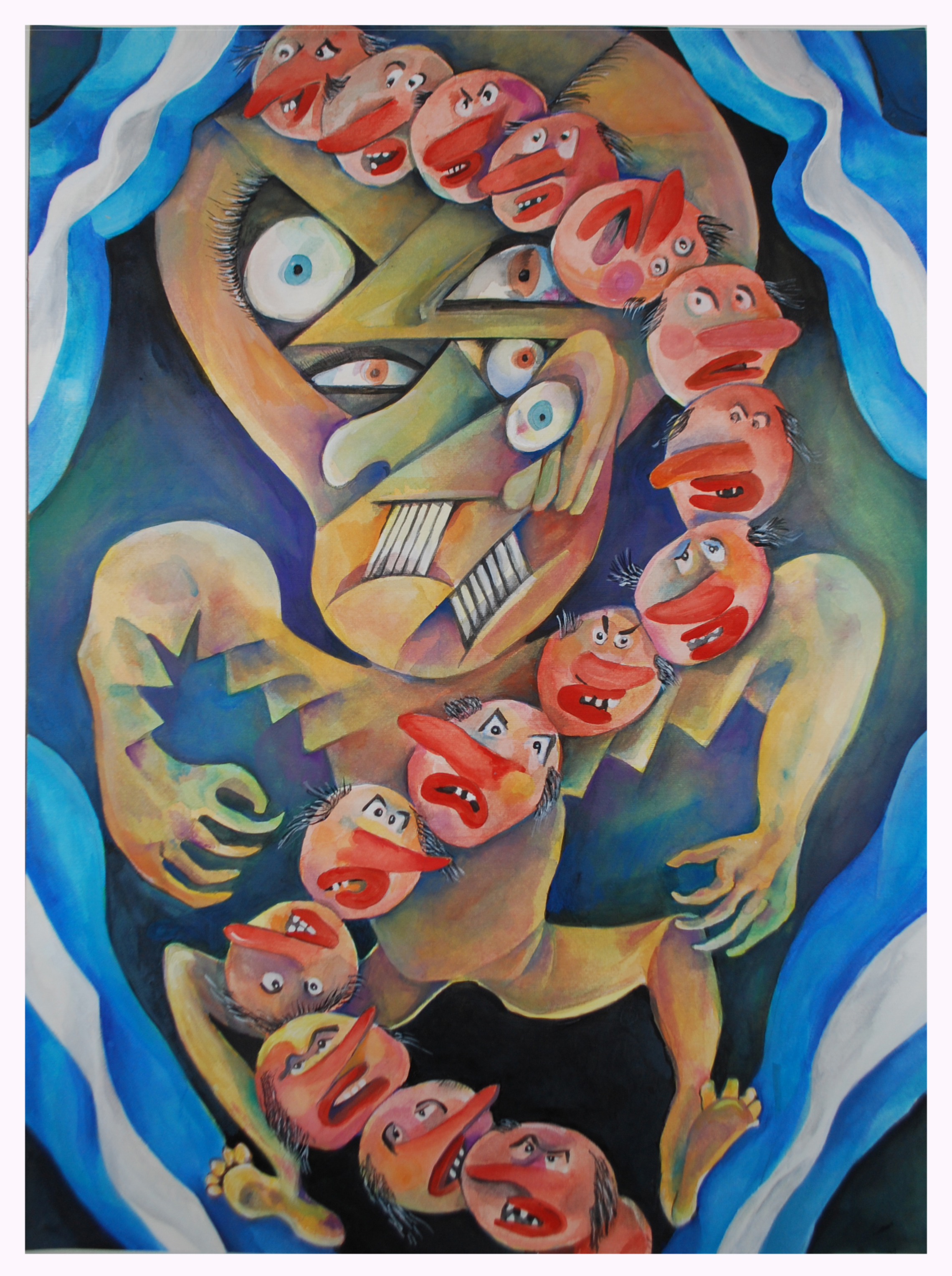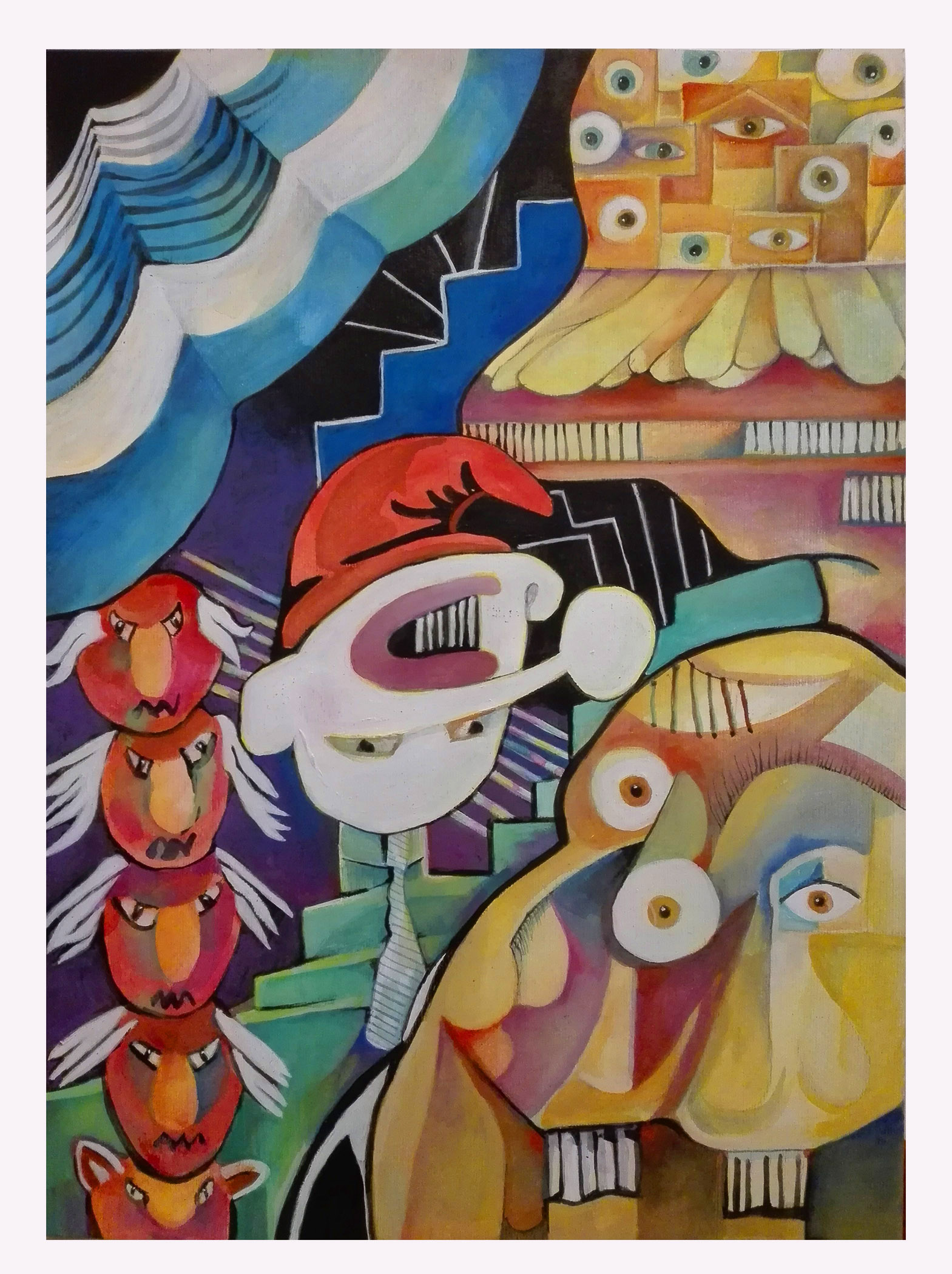 LC: Vos decís “Influencias españolas”, es una bandera que baja desde el noreste de la tela trayendo unos rostros cubistas. Entre otras cosas esa obra alude a que se dice que el arte argentino siempre estuvo muy influenciado por Europa. Lxs argentinxs valoramos secretamente algo y públicamente lo denostamos, jaja, ¡yo lo hago!. ¡El cubismo y sobre todo el surrealismo, fueron desprestigiados por otras facciones del arte! Es que triste o felizmente, según quien lo mire, los símbolos patrios, los símbolos nacionales, no solo en Argentina, son un lastre de algo que está rancio y que tiene un tufillo a encierro. Es pesado. Ya nadie se los banca. Son ruinas, estandartes medievales.