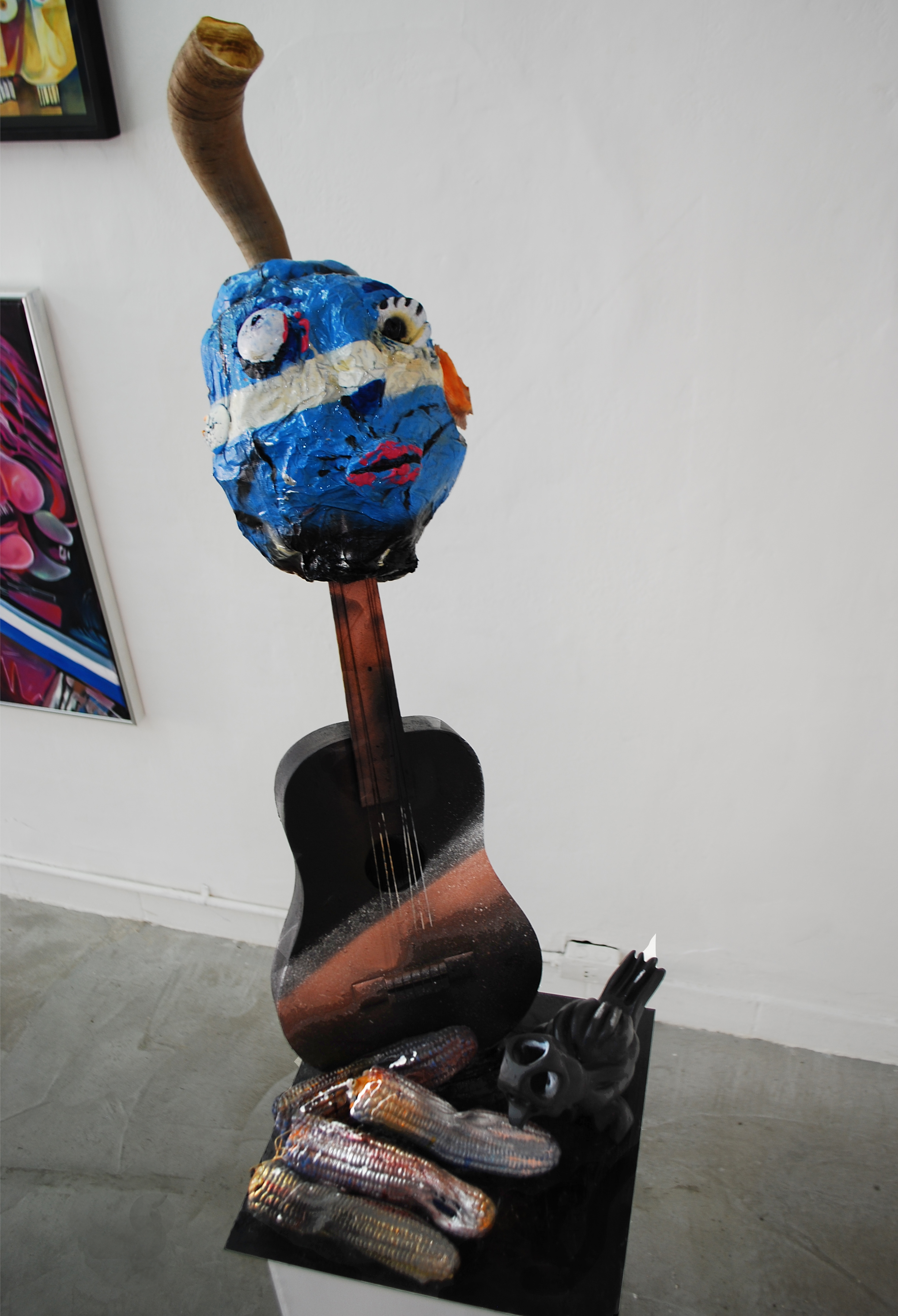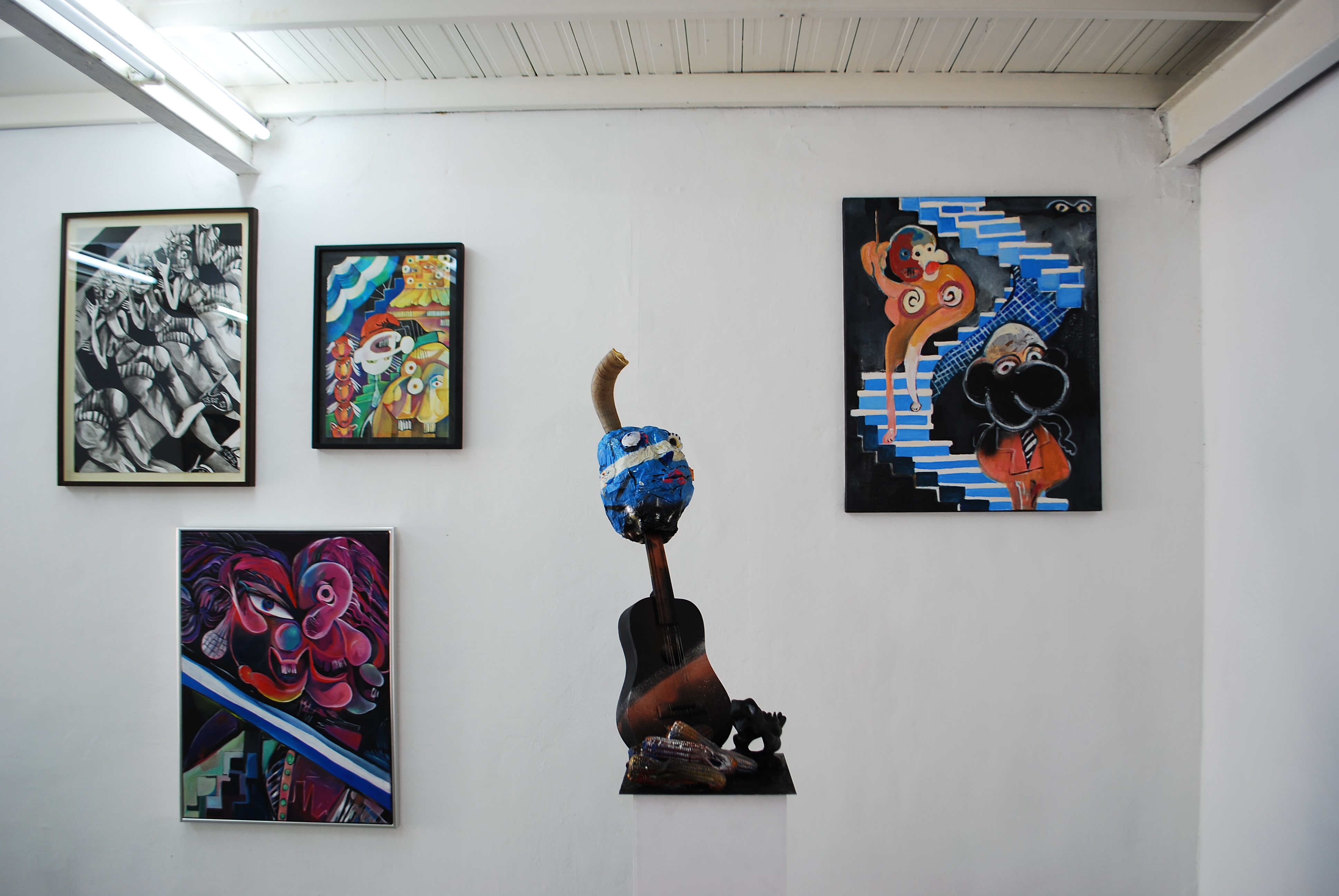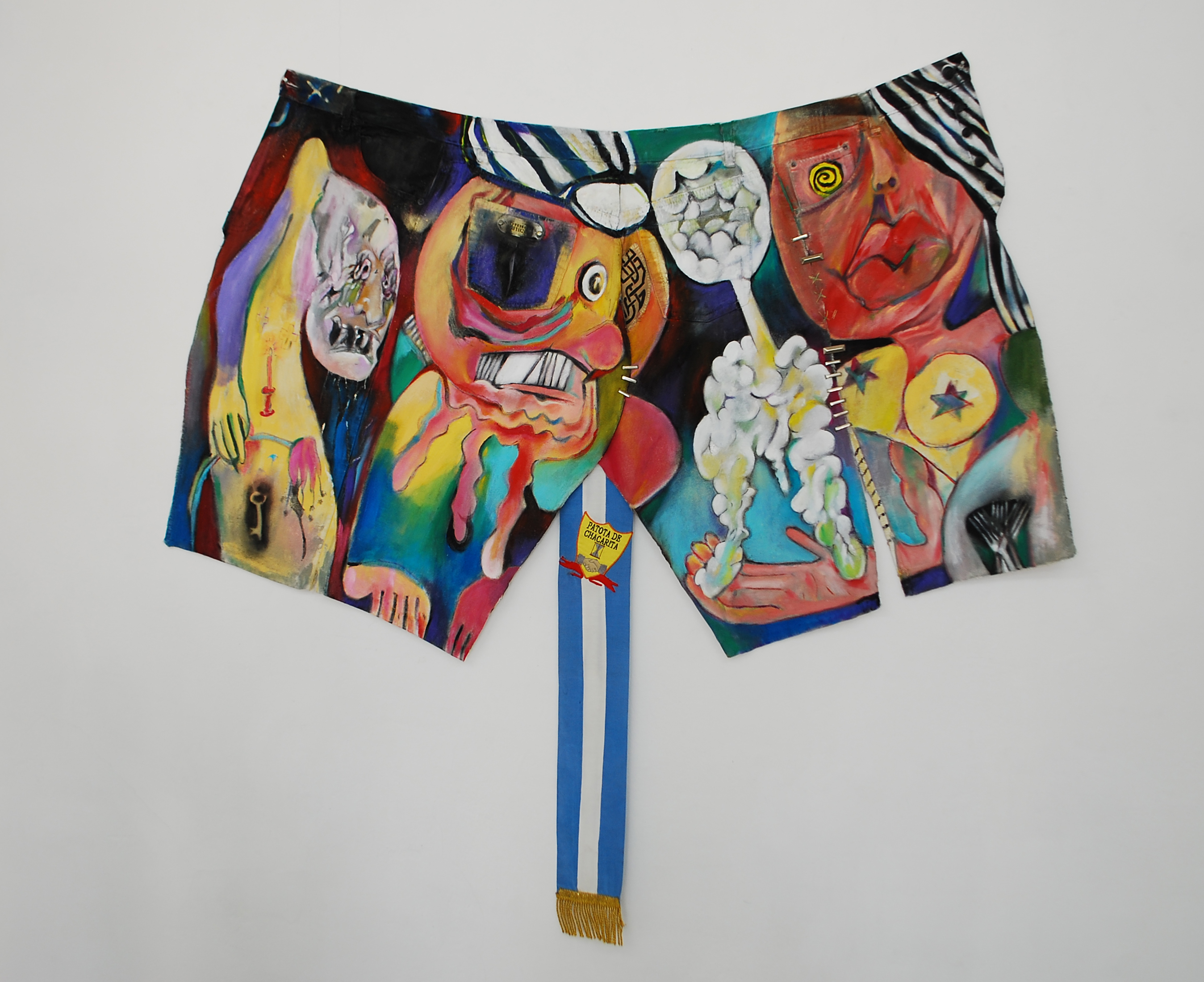 JL: La Verdad como un intento, no como un dogma. En la muestra aparece la idea de patria, presente en las banderas, escudos, guitarras, bandas presidenciales. Ahí creo que está presente la cuestión de la verdad y de la identidad. Vos matizas todo eso, trazas un panorama chirle de la Historia. De hecho muchas personas usan alternativamente las palabras Historia y Verdad. Vos te tomas con responsabilidad pero en solfa conceptos como el de patria a través del chiste, que sería toda la muestra como un relato y en definitiva un intento de verdad. En paralelo la muestra me hizo imaginar que la hiciste porque hay algo del empuje del pasado, de la tradición en el presente, de los colores, de las formas expresionistas anónimas, que intentas organizar para saber qué pasa con el humor en la vida colectiva.
