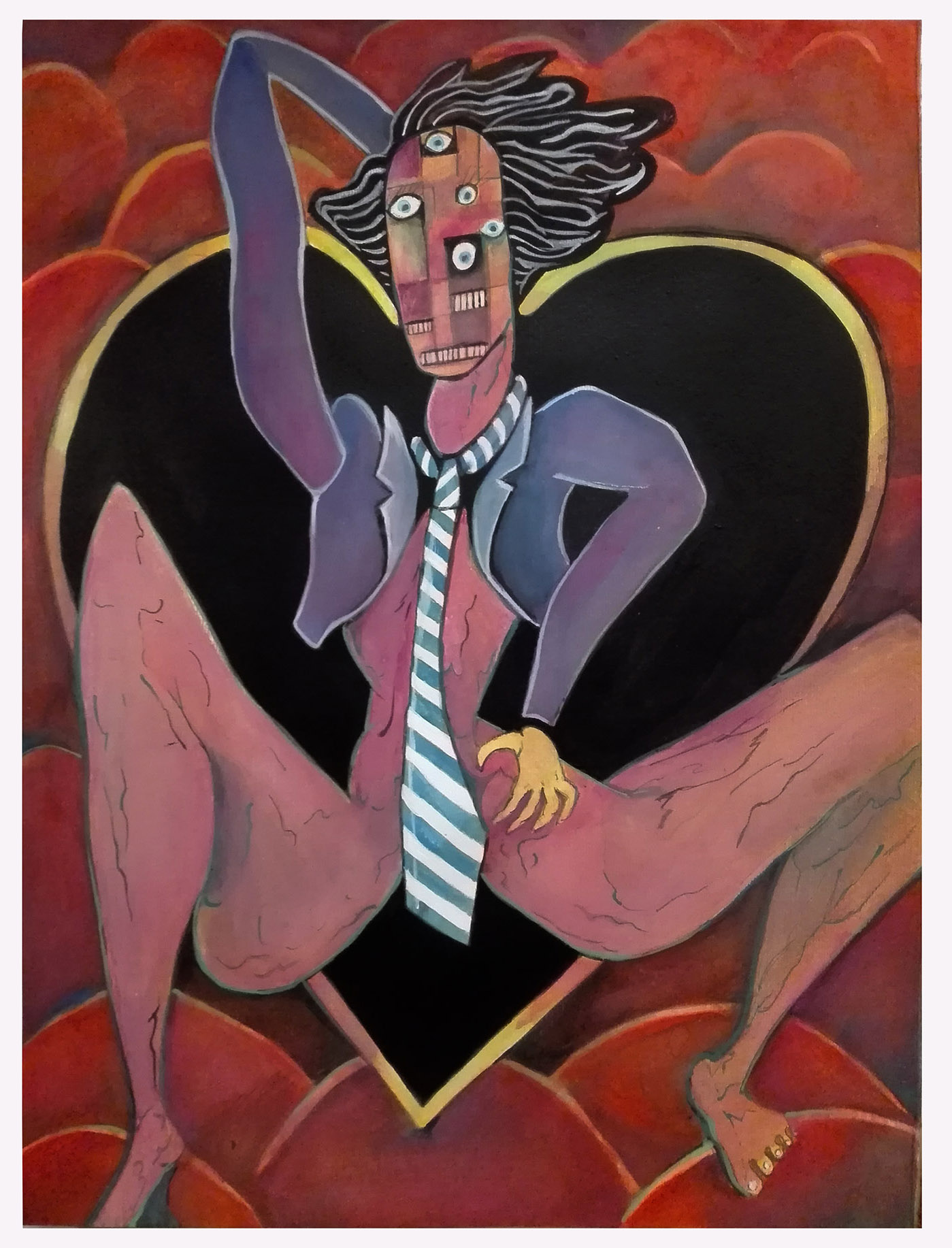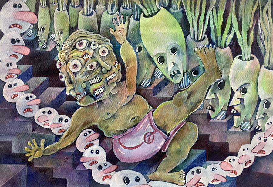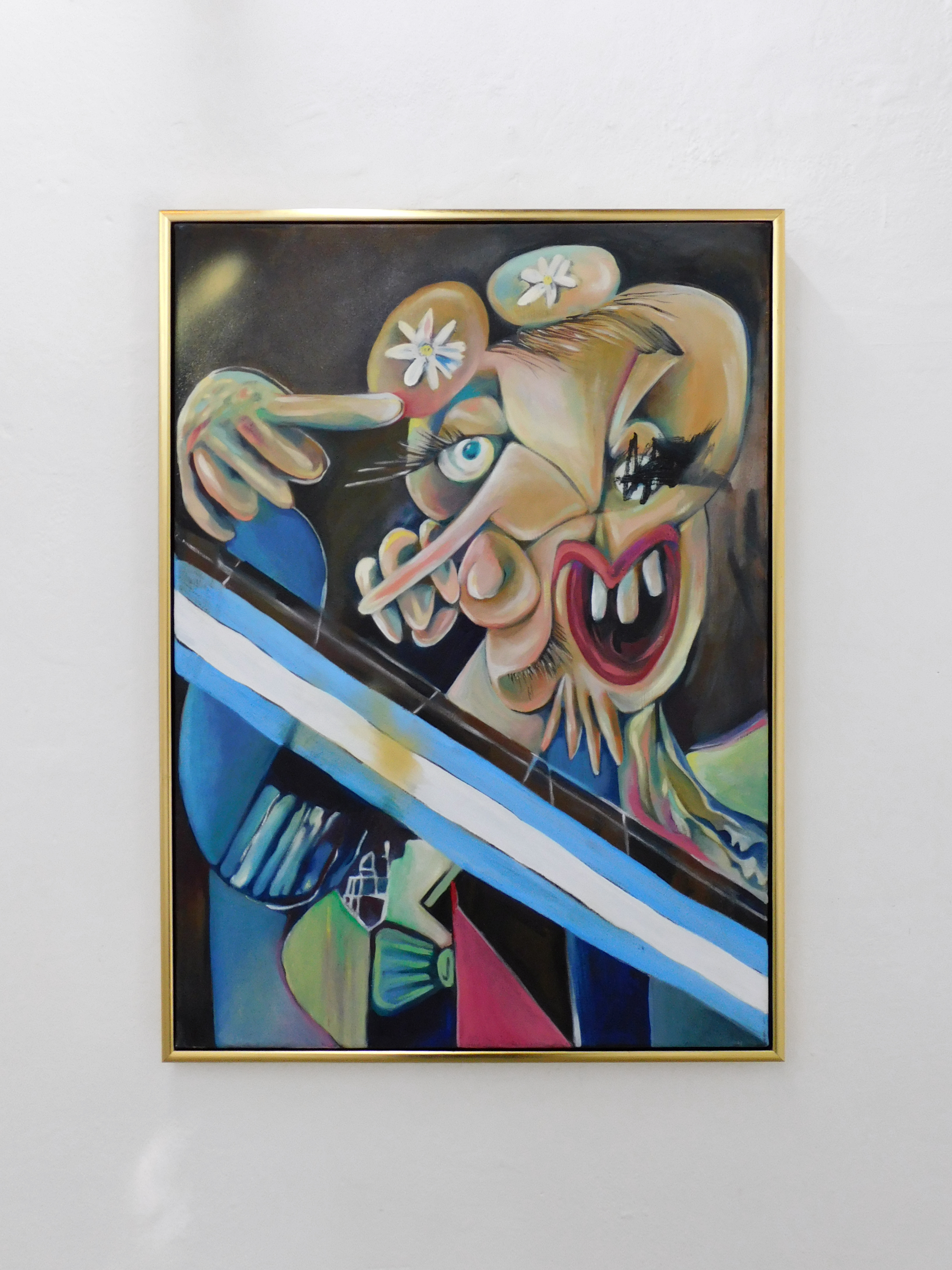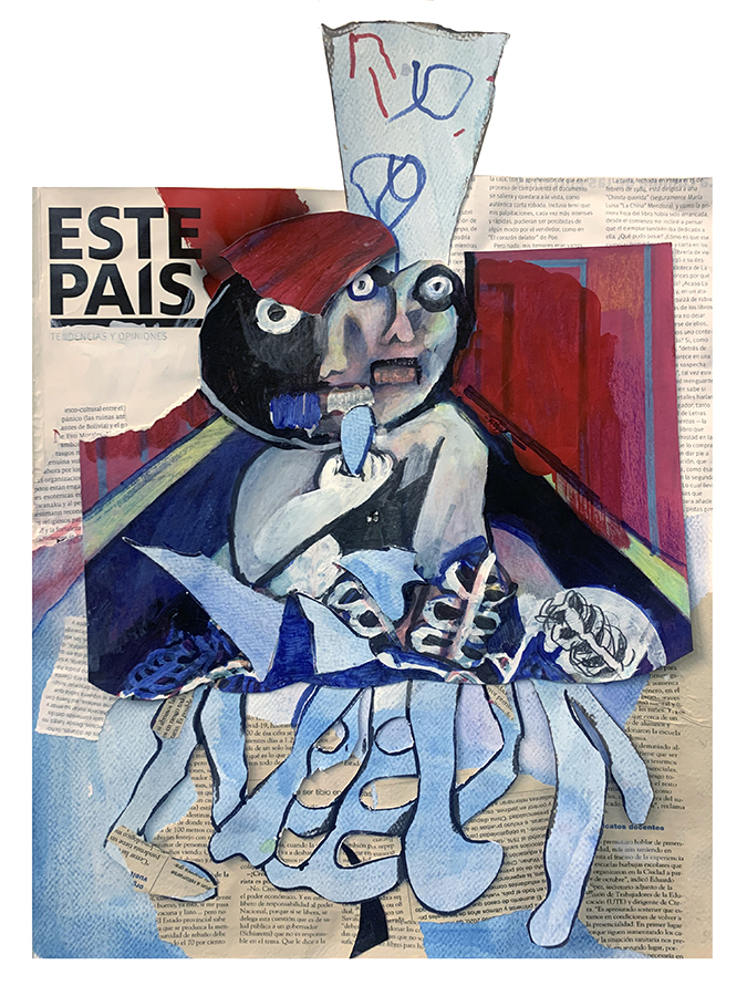 LC: El otro día agarré un libro de los cantares de gesta medieval que me hizo pensar en los bufones. En las pinturas de la muestra hay un personaje que es El Noticiero, y que es como un familiar para mí, porque en mi casa siempre estaba prendida la tele en el canal de noticias en la mesa de almuerzo. Es un cabezón ridículo pero también siniestro. Igual no se nada de los bufones, me imagino a unos vagabundos mercenarios. La presencia del noticiero marcó muchas cosas en mi vida, como un fantasma de entidad paternalista, en la cabecera de la mesa, desde el televisor. Por eso le hice la cabeza grande. La cabeza, que es el lugar donde se toman decisiones, digamos. El órgano rector.