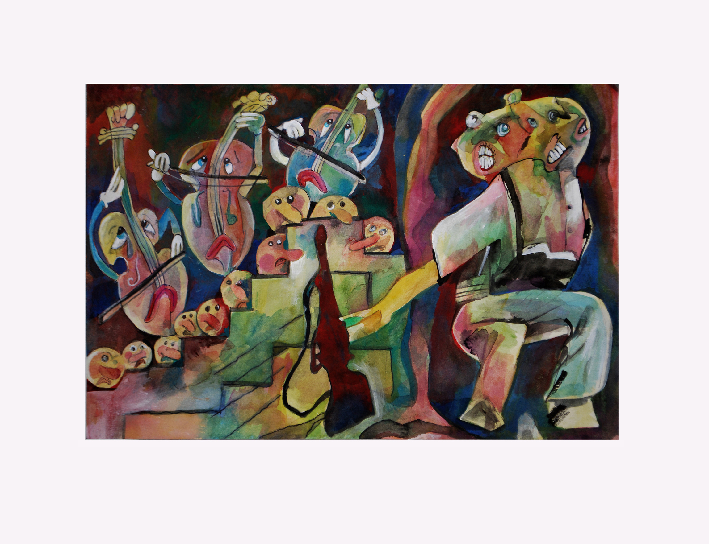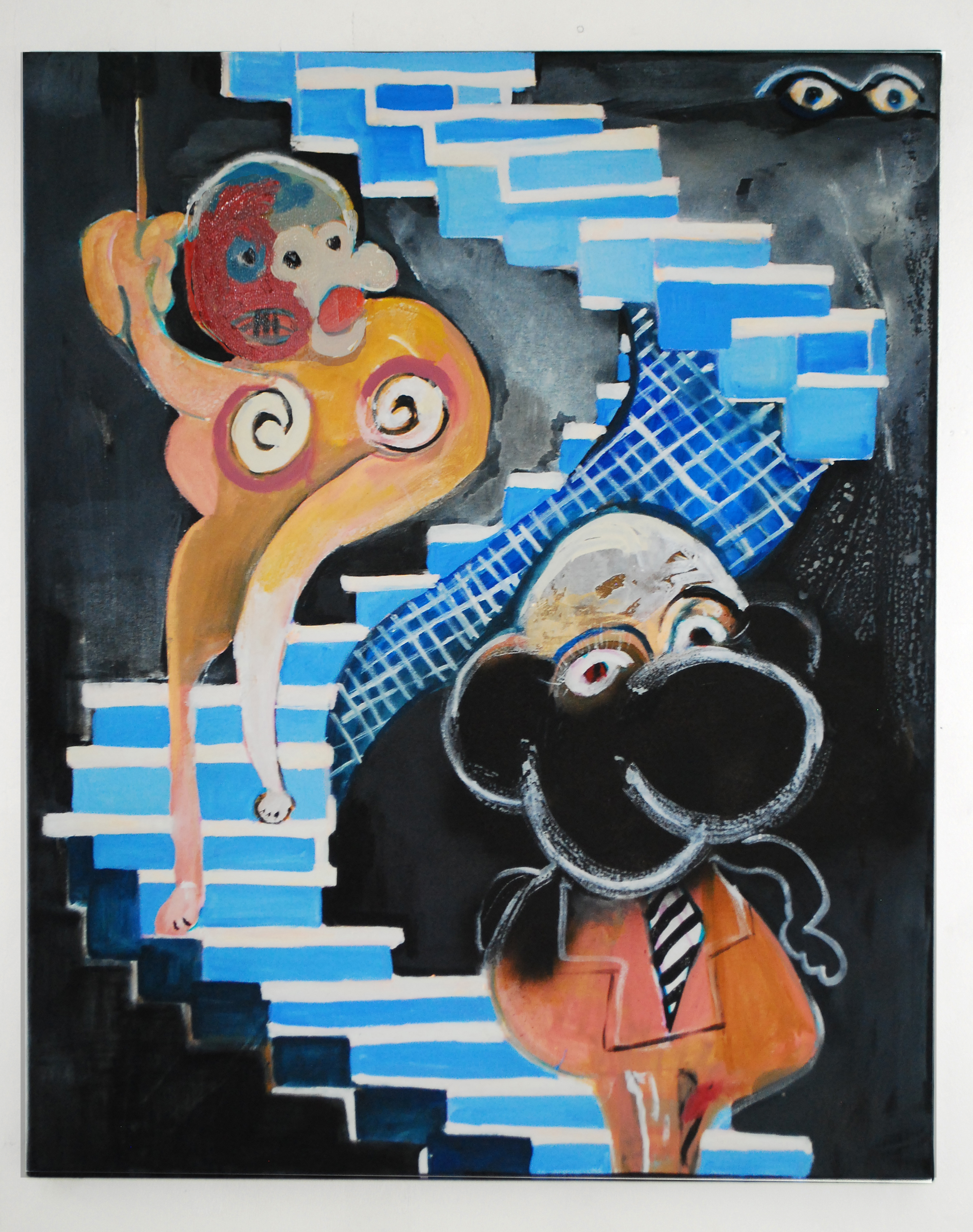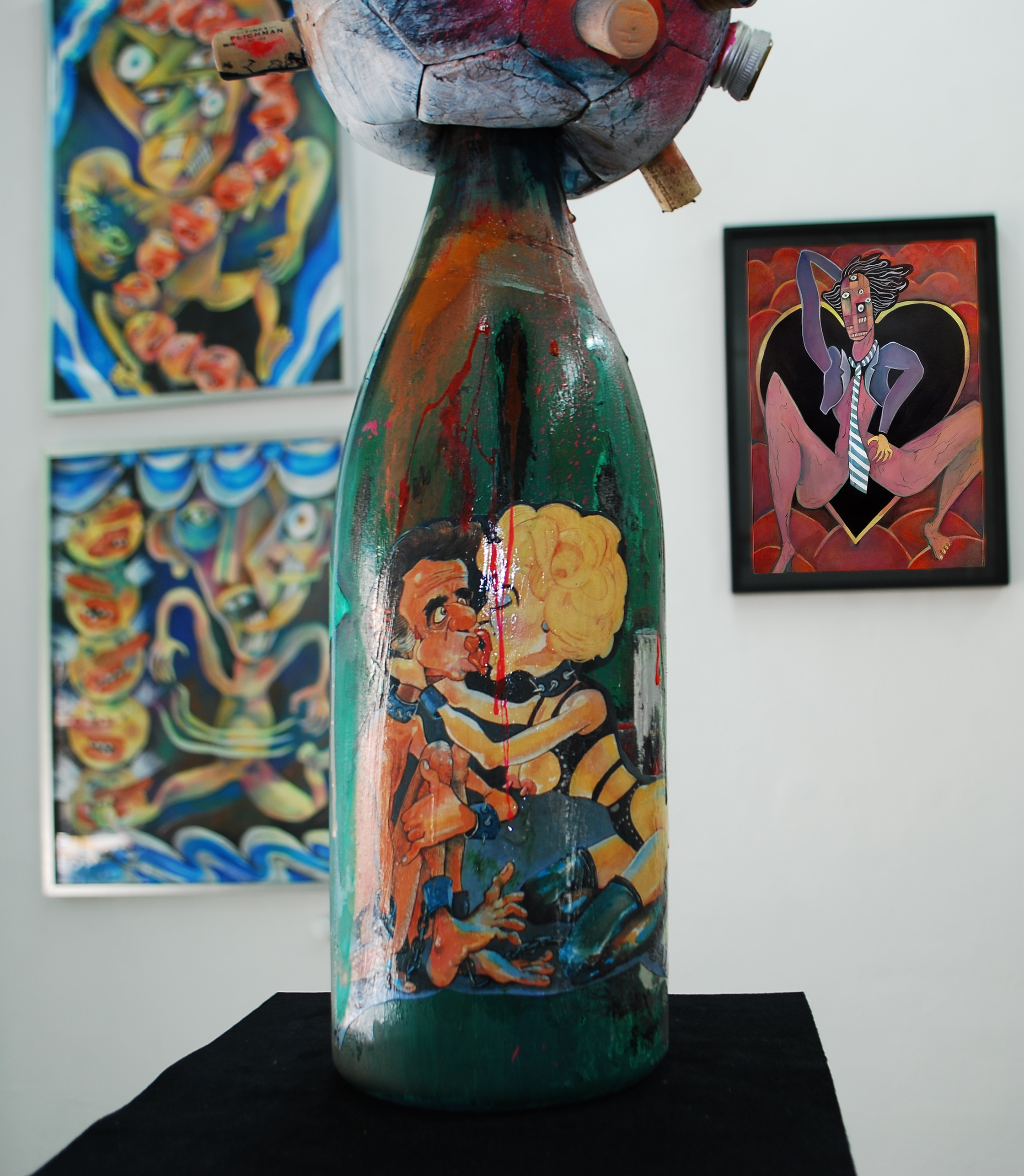LC: El otro día agarré un libro de los cantares de gesta medieval que me hizo pensar en los bufones. En las pinturas de la muestra hay un personaje que es El Noticiero, y que es como un familiar para mí, porque en mi casa siempre estaba prendida la tele en el canal de noticias en la mesa de almuerzo. Es un cabezón ridículo pero también siniestro. Igual no se nada de los bufones, me imagino a unos vagabundos mercenarios. La presencia del noticiero marcó muchas cosas en mi vida, como un fantasma de entidad paternalista, en la cabecera de la mesa, desde el televisor. Por eso le hice la cabeza grande. La cabeza, que es el lugar donde se toman decisiones, digamos. El órgano rector.